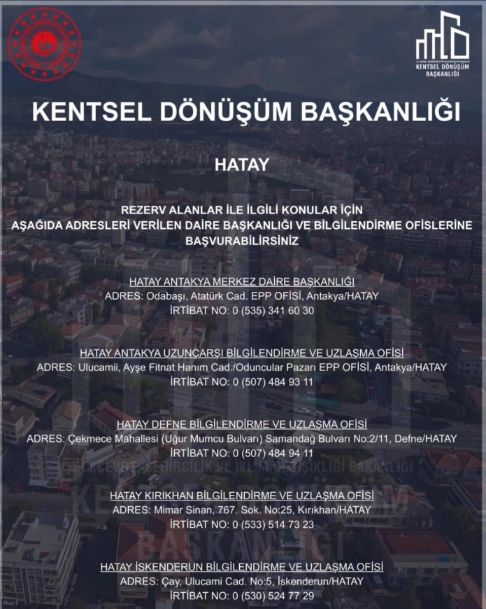 Başkanlıktan yapılan açıklamada “Kentsel Dönüşüm Başkanlığımız tarafından Hatay’da yürütülen rezerv alanlara ilişkin işlemler kapsamında; vatandaşlarımız, bilgilendirme ve uzlaşma süreçlerine dair tüm konular için il genelinde hizmet veren Antakya Merkez Daire Başkanlığı ile Bilgilendirme ve Uzlaşma Ofislerimize başvuruda bulunabilirler.