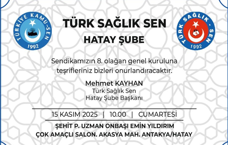 Hatay genelinde sağlık alanında sendikacılık faaliyetlerini sürdüren Türk Sağlık-Sen Hatay Şubesi’nin 8’inci Olağan Genel Kurulu 15 Kasım 2025 Cumartesi günü saat 10.00’da Akasya Mahallesi’nde Antakya Belediyesi’ne ait Şehit P. Uzm. Onbaşı Emin Yıldırım Çok Amaçlı Salonu’nda gerçekleştirilecek.
