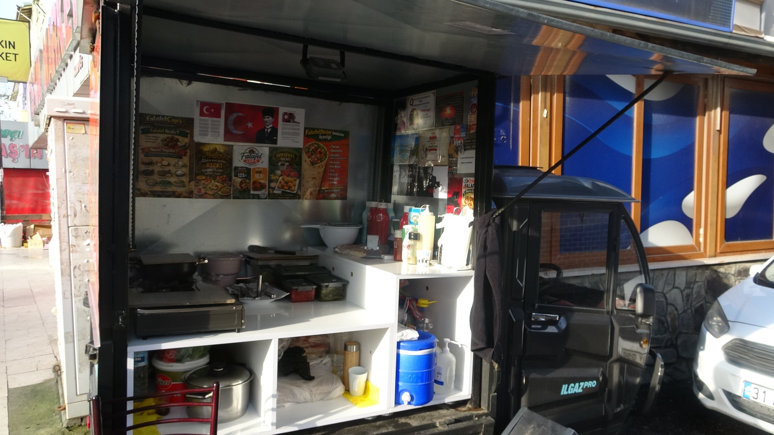 Yıllarca izlediği videolardan ilham alan Çapanoğlu, bugün 1,5 metrekarelik seyyar tezgahında falafel satarak geçimini sağlıyor.