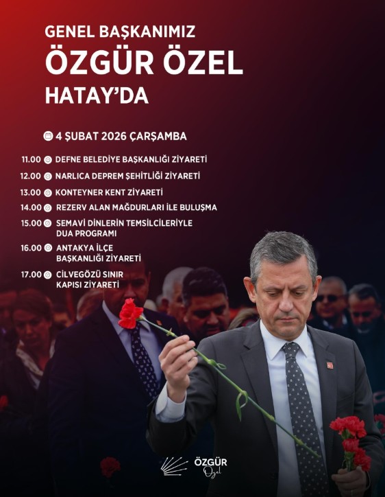 CHP Hatay İl Başkanlığı tarafından tertiplenen program kapsamında yarın Hatay’a gelecek olan CHP Genel Başkanı Özgür Özel sırasıyla Defne Belediye Başkanlığı, Narlıca Deprem Şehitliği, Konteyner Kent, Rezerv Alan Mağdurları, Semavi Din Temsilcilerinin Dua Programı, CHP Antakya İlçe Başkanlığı ve Cilvegözü Sınır Kapısı’nı ziyaret edecek.