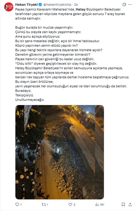 CHP Hatay İl Başkanı Hakan Tiryaki sosyal medya hesabından Payas’ta medyana gelen ve istinat duvarının çökmesi sonucu 7 aracın zarar gördüğü olayın ardından eleştiri oklarını Hatay Büyükşehir Belediyesine yöneltti. Tiryaki toprak kaymasının nedenini HBB tarafından yürütülen köprü yapım çalışmalarından kaynaklandığını iddia etti. Tiryakinin paylaşımı şöyle “Payas ilçemiz Karacami Mahallesi’nde, Hatay Büyükşehir Belediyesi tarafından yapılan köprüde meydana gelen göçük sonucu 7 araç toprak altında kalmıştır.